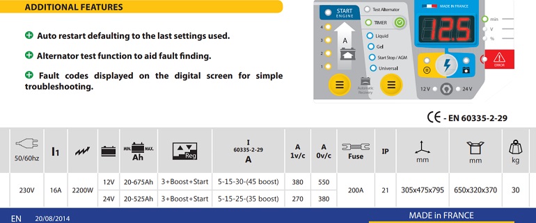 Charge all battery types: Select the charging curve for the battery type - Liquid, Gel, AGM - or if this is not known select the Universal Mode which will ensure a safe change for any of these battery types. Choose from 4 charging outputs, 5A, 15A, 20A and 40A. Charge to 100% safely: The advanced multi-stage charger will charge to 100% and does not require supervision or the battery to be removed from the vehicle. At the end of the charge the charger enters a float mode to maintain the battery at 100%. Smart : This device permanently analyses the health of the battery and automatically adjusts the output voltage. The voltage and the percentage of charge are displayed in real time on the digital screen. Protection for the vehicle electronics: No need to disconnect the battery from the vehicle. No risk of sparks, there is no voltage to the clamps when they are not connected to a battery. Charging a deeply discharged battery: The STARTIUM can charge batteries discharged to as low as 1V. This is not possible if the battery is damaged. TIMER : Function which permits safe charging when charging deeply discharge batteries (< 1V). SOS RECOVERY : Enables the recovery of sulphated batteries. Automatic start : The device will automatically start sending current to the battery when the starter function of the car is being activated. The remote control is not required anymore. Smart start : The STARTIUM 680E will automatically detect damaged or badly sulphated batteries. In this event it will not deliver current in order to protect the vehicle electronics.